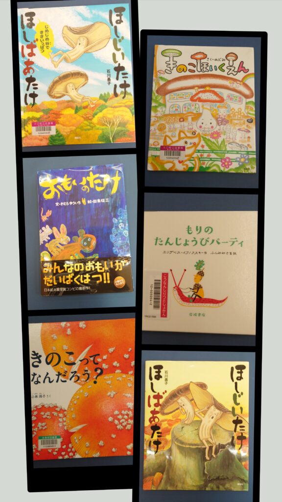 そんな中、ドーンときのこが載ってる絵本とチラリと『きのこ』が隠れキャラのように載っている絵本が集まりました。