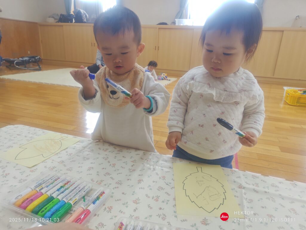 「クラフト」は落ち葉の形をした紙に模様を描いてもらいました。