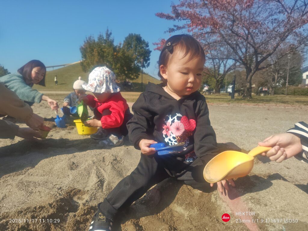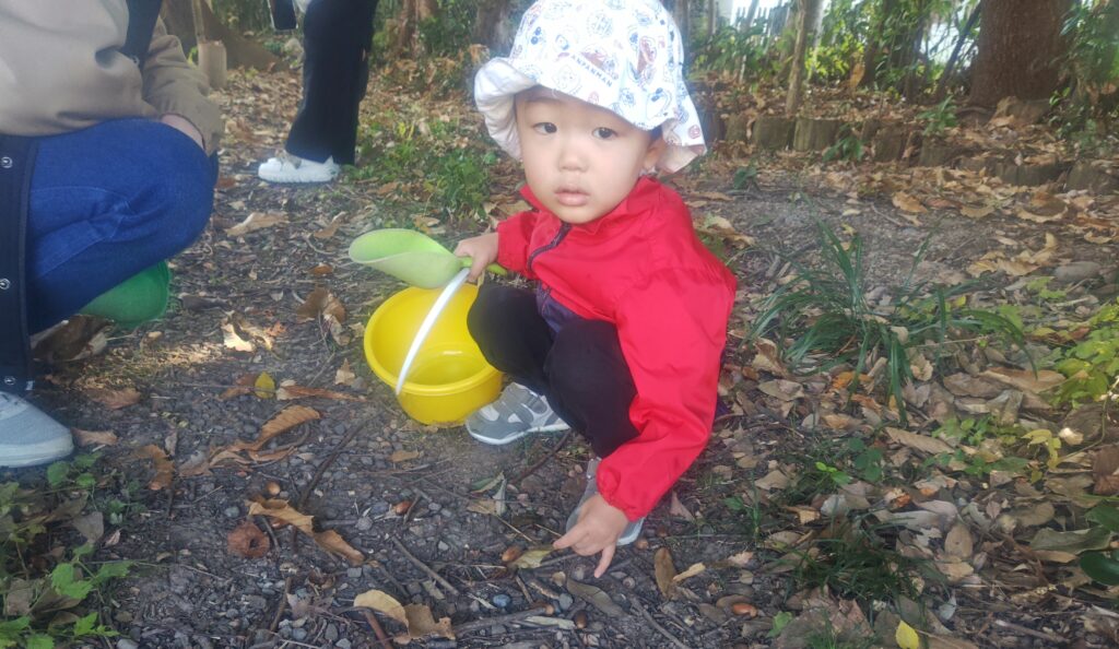 西小学校のビオトープでどんぐりや落ち葉を拾い